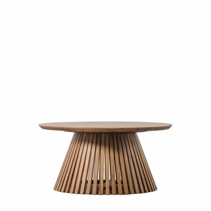 Add a stylish contemporary look to a room with this stunning coffee table. The base features gently sloping wood slats which create a stunning design feature. The table is crafted from solid acacia wood in a natural finish to show the grain of the timber. A matching dining and side table are also available