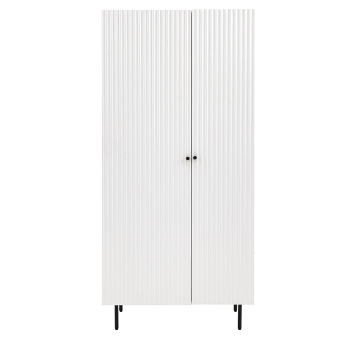 Featuring lovely door fronts with a stylish vertical scalloped design, giving a unique upmarket look, this contemporary wardrobe has a white painted finish. Black metal legs and handles complete the look. Perfect for any contemporary apartment interior, the wardrobe would equally at home in a wide range of interiors. Matching pieces available. Also offered in grey and blue