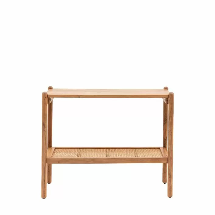 Boho Inspired with a modern twist this console table is made with rich grain fillied Mango wood with a woven rattan low shelf, perfect for storage. The perfect fit for both modern and vintage inspired interiors this console table will add the finishing touch to any room. Coordinating pieces also available.