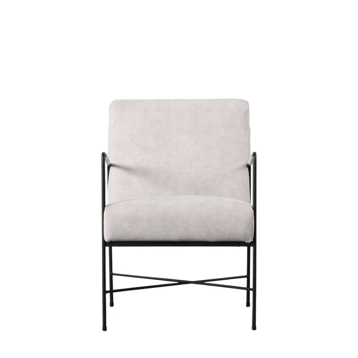 Contemporary armchair with a black metal frame which is paired with an upholstered seat and back. With the narrow metal arms featuring fabric wrapped detail, it is perfect for apartment living or other smaller spaces. The armchair is also available in grey.