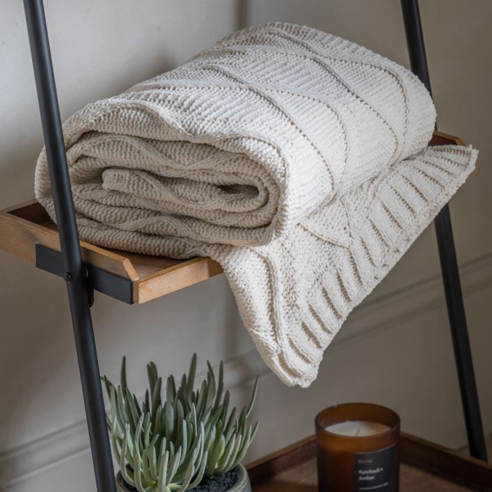 Super soft chunky cable knit diamond throw in cream with a rib knit border. This throw offers a cosy and rustic feel and is available in 2 colourways. Crafted in India.