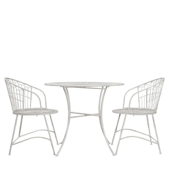 Offering a more unusual take on traditional bistro café style, this set features a flowing design which is echoed in the round seats and lovely curved backs of the chairs. Crafted from metal, it has a lovely metal patina finish. It is also available in a distressed soft white finish. Sold separately, we also offer round seat pads, designed to work perfectly with these chairs, to add comfort so you can relax for longer.