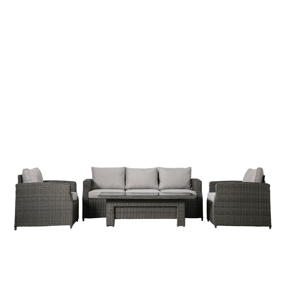 This 3 Seater Sofa Dining Set Rising Table, which features a 3-seater sofa, two armchairs and a riser table, is ideal for both eating and relaxing. The table offers an innovative design feature which allows it to be used as a dining table or it can be easily lowered for use as a coffee table. All pieces are crafted from all weather 5mm PE rattan with a hand woven mixed half round/full round weave in a washed grey finish. For comfort, the sofa and chairs have luxurious showerproof cushions in a soft grey colour to complement the colour of the rattan. The frames are powder coated aluminium and the table top is tempered glass. The set is also available in a natural finish. The collection offers a great range of pieces, so you can select the ones to suit your requirements. Assembly required.