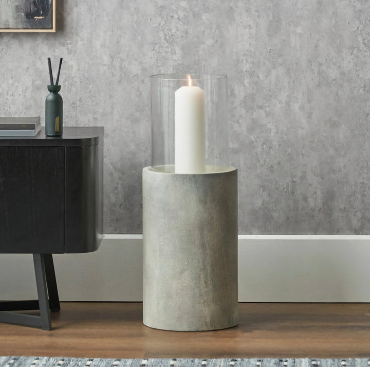 This large hurricane, crafted in India, with a stone grey metal finish and glass surround will look fabulous with a large pillar candle, and is guaranteed to make a statement. Add atmosphere and ambience to your home, from your living room to your hallway.