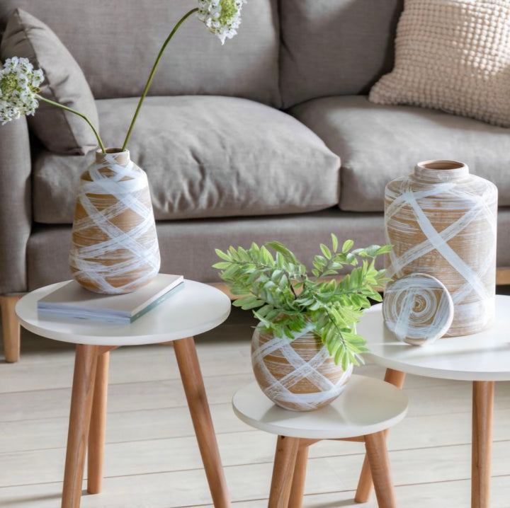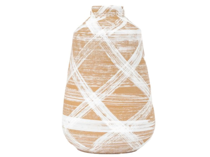 With a hand painted brushstroke style white glaze, this tall the vase is handmade and truly unique, it's sure to bring a little rustic charm to any space. Matching pieces also available.