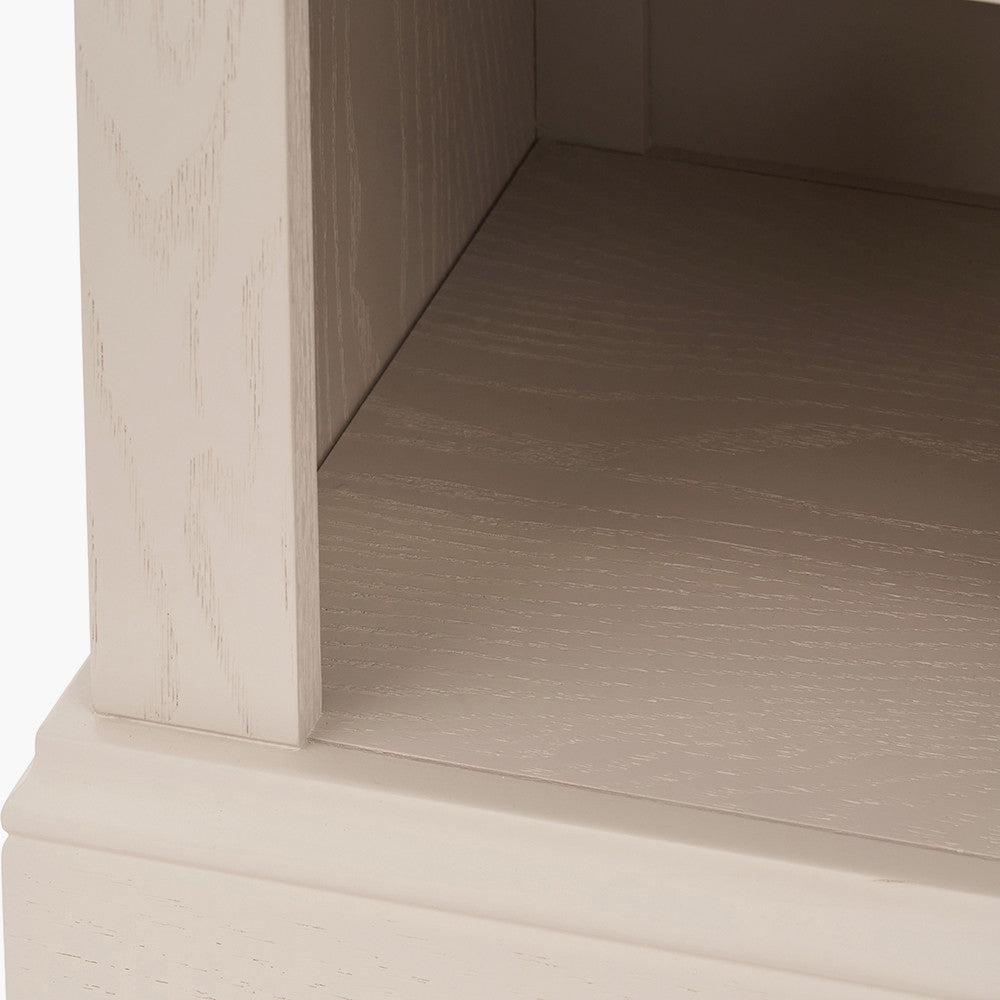 Add a touch of country charm with the Fairford white bedside unit. Expertly crafted in Vietnam from pine wood, this piece showcases a beautiful contrast between its parchment white base and warm oak top. The silver metallic handle adds a touch of sophistication to the drawer, blending classic style with modern elegance. Perfect for enhancing any bedroom with functional style. This unit looks just at home when used as a side or lamp table in any room in the home.