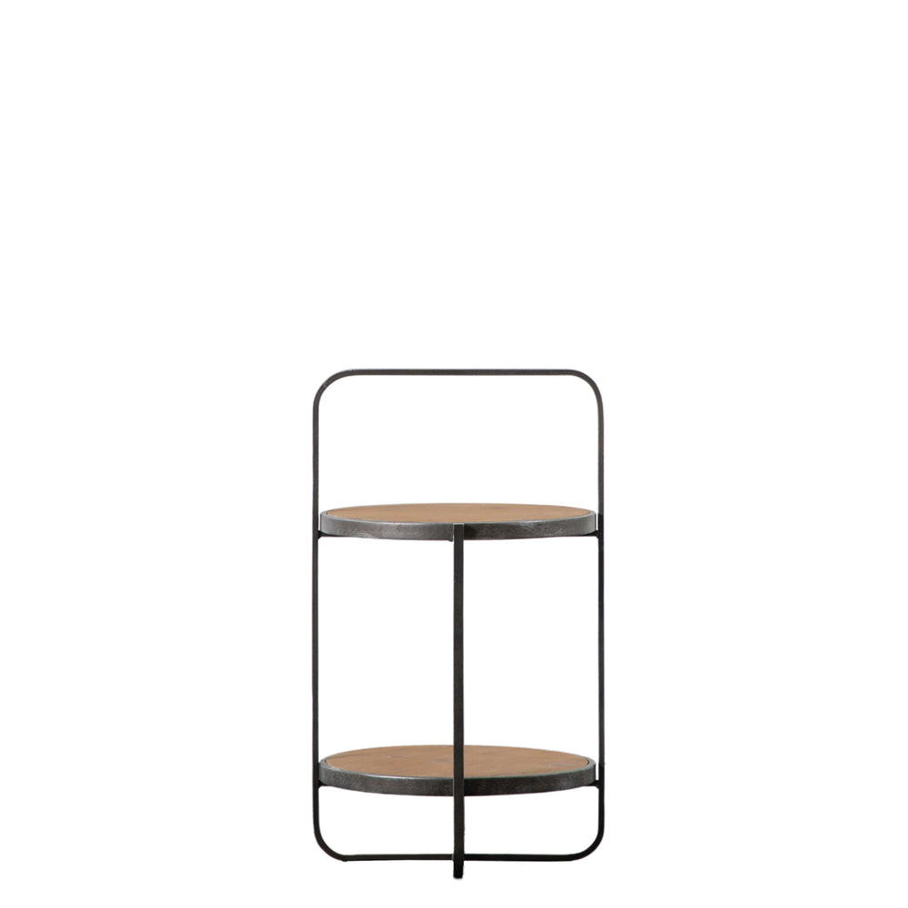 Contemporary side table crafted from metal with an antique pewter finish combined with a fir veneer top and shelf with a natural finish with a light wash to highlight the grain of the wood. The unusual design features a continuation of one section of the base, up and over the tables to create a 'handle' effect.