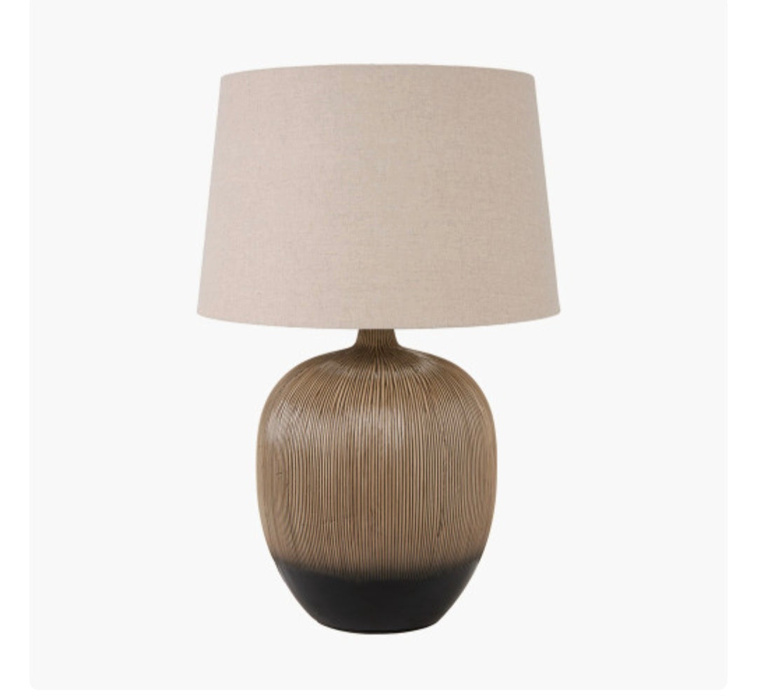 The stunning ceramic table lamp with an elegantly curved base has a subtle textured effect, further accentuated with a stylish black to natural ombre. The lamp base is topped off perfectly with a tapered, self-lined shade in a natural hue. This versatile table lamp will look fabulous in any scandi-style interior, with its black and natural colour palette and delicate tactility.