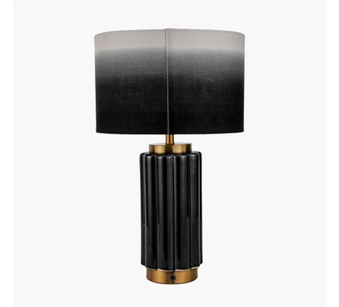 The elegant cylindrical, scalloped table lamp in a bold black colourway is adorned top and bottom in a statement brushed gold. The striking base showcases a stylish ombre, self-lined shade that complements the base superbly. The black colourway is extremely versatile and will look fabulous in any interior.