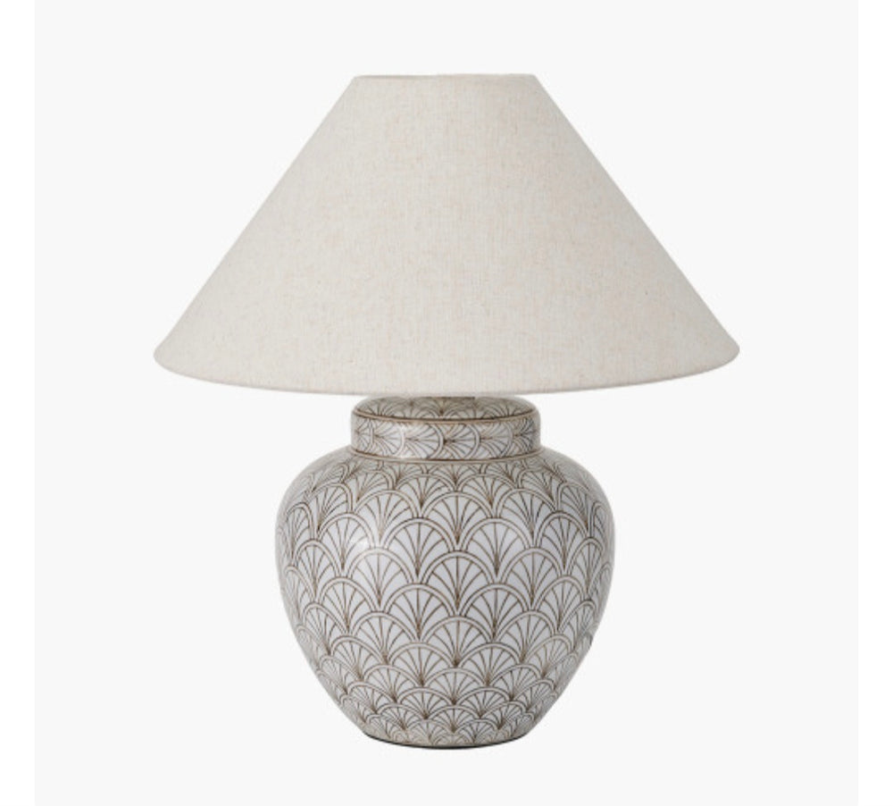 Barbier White Art Deco Fan Ceramic Table Lamp Base with Milos 35cm Natural Linen Tapered Lampshade