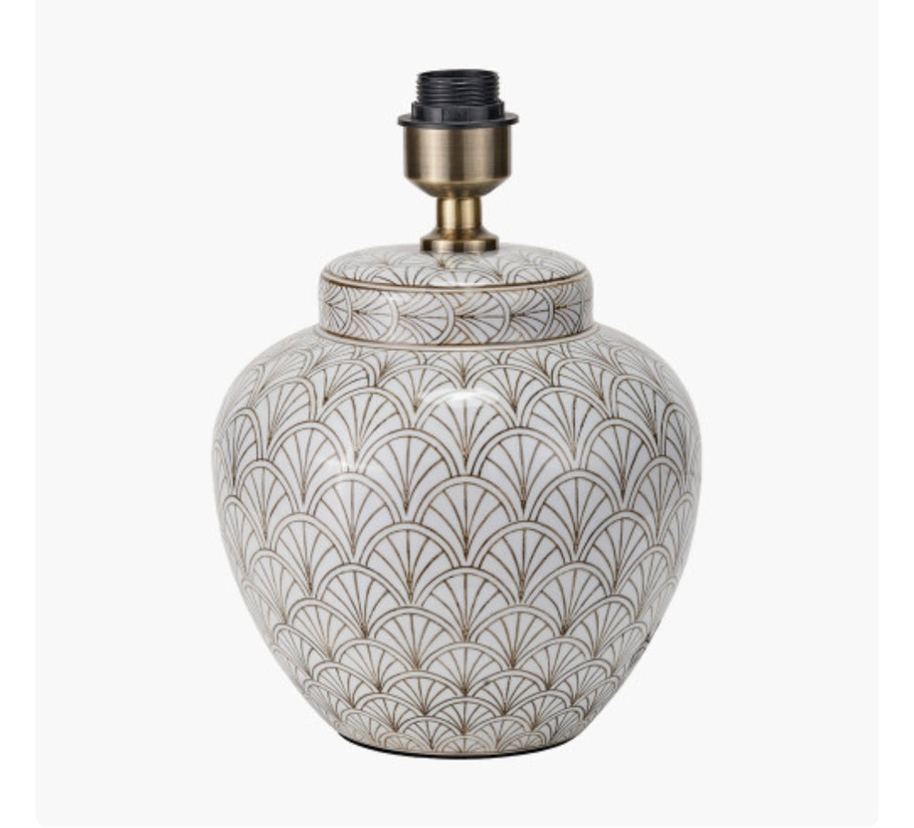 Barbier White Art Deco Fan Ceramic Table Lamp Base with Posy 35cm White Handloom Scalloped Tapered Lampshade