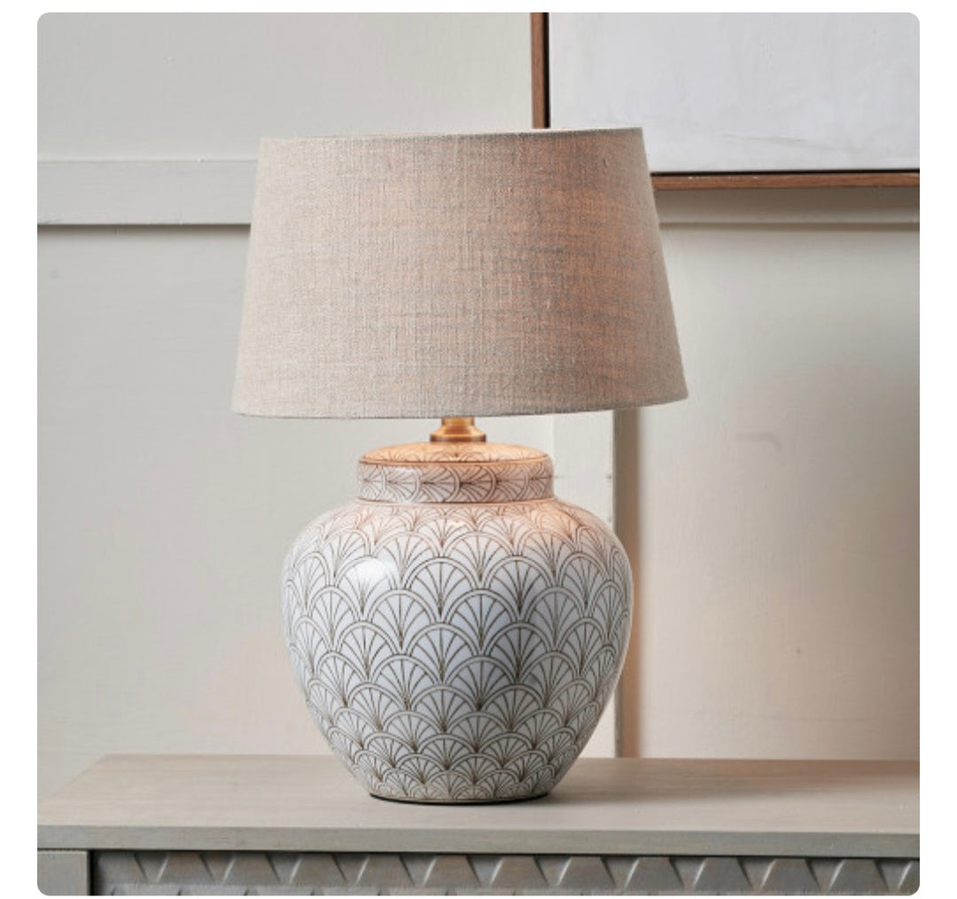 Barbier White Art Deco Fan Ceramic Table Lamp Base with Harley 45cm Slubby Hopsack Empire Lampshade