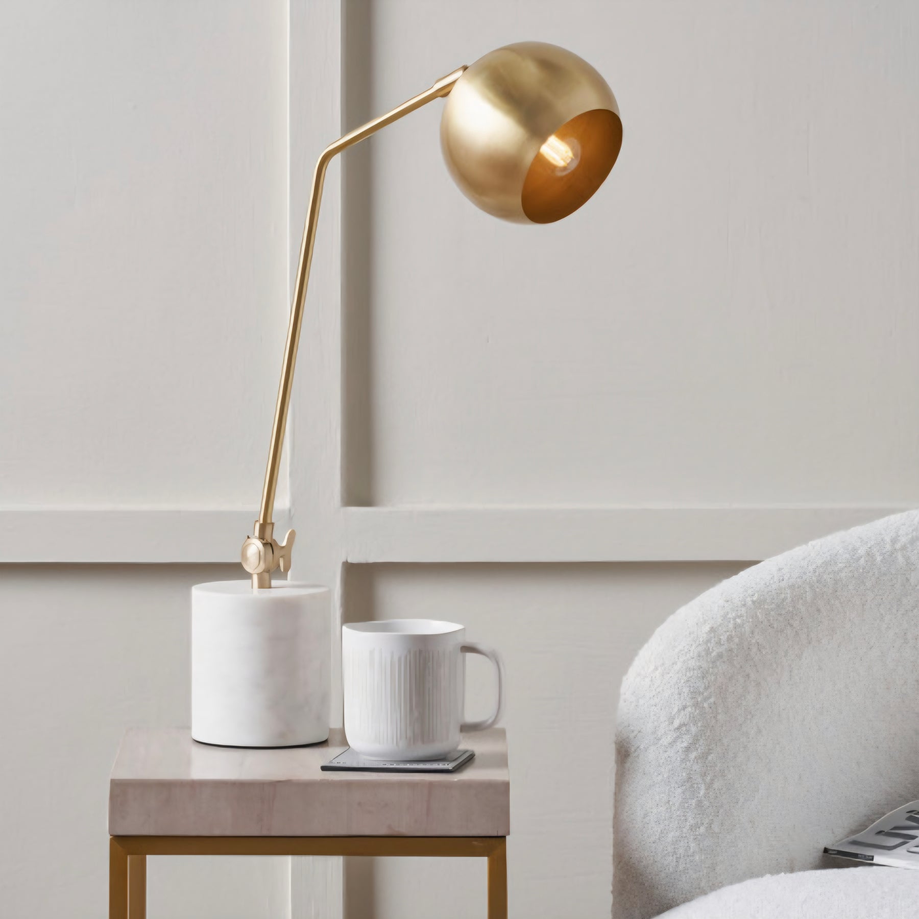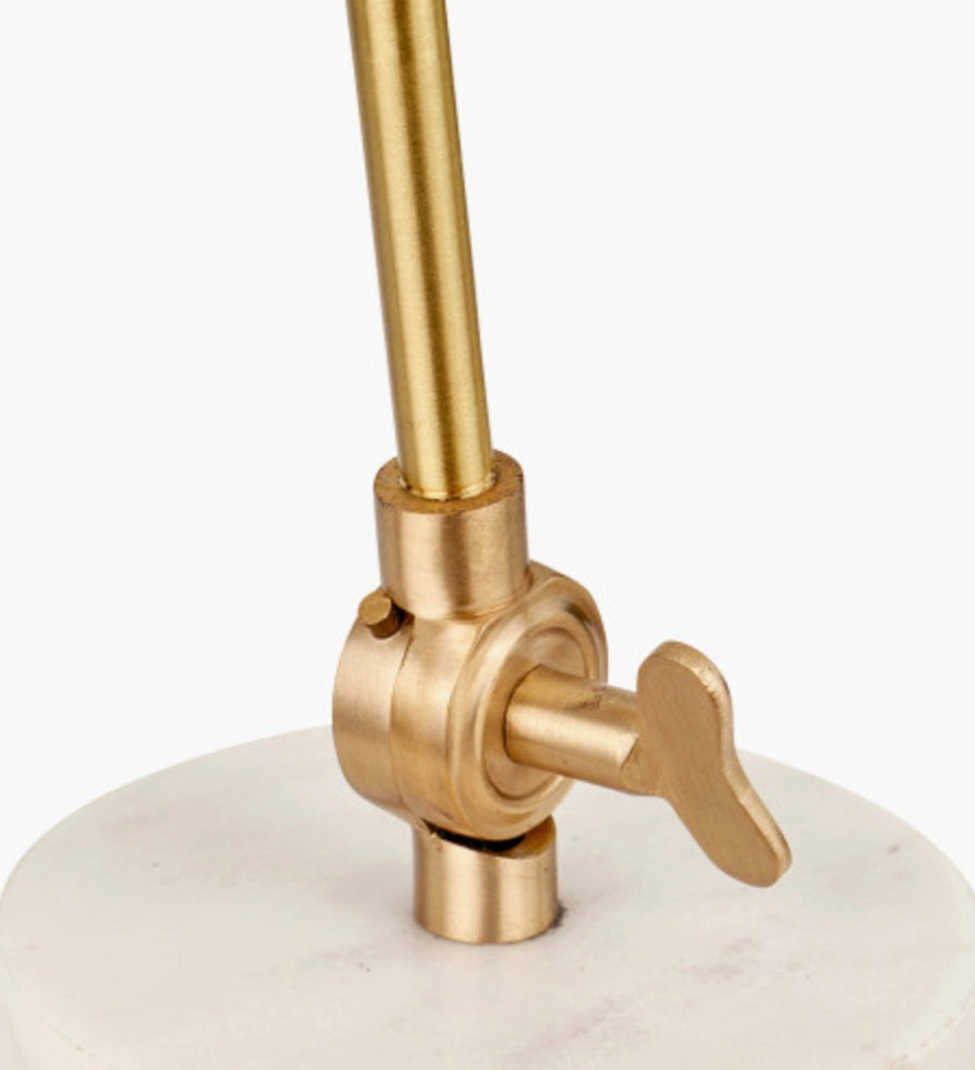 This exquisitely contemporary yet functional table lamp, uses gold metal and white marble. The multi-directional lamp head and stem can be easily adjusted to meet your lighting needs. Made in India, the Eloise lamp uses elegant lines and soft curves to create a stylish and sophisticated light. Illuminate your lounge or home office with this stylish piece.