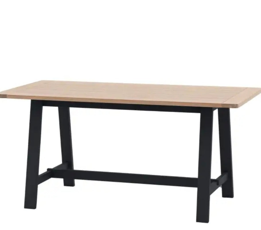 A modern take on a country style dining table, this rectangular trestle table features a grooved & planked oak top with the angular hand painted solid timber legs. Pairs perfectly with the coordinating bench or dining chairs.